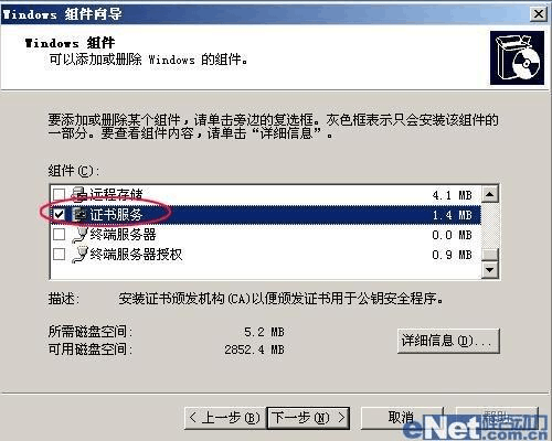 第一步:默認情況下windows2003沒有安裝證書服務(wù),我們通過控制面板的添加/刪除windows 組件來安裝“證書服務(wù)”。(如圖1)