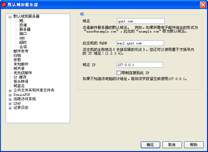域名處就是填寫您注冊的域名,然后再此主機(jī)FQDN 處填寫相應(yīng)的主機(jī)名mail.qast.com ,注意域名IP 這里建議填寫127.0.0.1,為了預(yù)防在未來的某一天您將這臺服務(wù)器的ip 修改之后導(dǎo)致郵件無法收發(fā)。