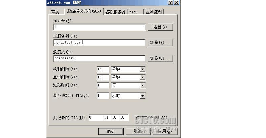 如下圖所示,我們把區(qū)域的SOA 記錄也同樣進(jìn)行修改,現(xiàn)在區(qū)域的主服務(wù)器是ns.adtest.com. ,這樣SOA 記錄也修改完畢了。