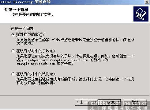 在這里由于這是第一臺(tái)域控制器,所以選擇第一項(xiàng):“新域的域控制器”,然后點(diǎn)“下一步”: