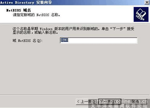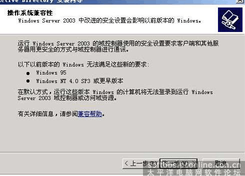 這里是一個(gè)兼容性的要求,Windows 95及NT 4 SP3以前的版本無(wú)法登陸運(yùn)行到Windows Server 2003的域控制器,我建議大家盡量采用Windows 2000及以上的操作系統(tǒng)來(lái)做為客戶端。然后點(diǎn)擊“下一步”: