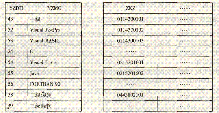 8. 某考試管理系統(tǒng)中有兩個表:考試語種表(tyz.dbf )和考生報名表(bm.dbf )。考試語種表含有語種代號(yzdh ,C ,2)和語種名稱(yzmc ,C5)字段,考生報名表含有準考證號(zkz ,C ,10)等字段,它們的數(shù)據(jù)如下表所示:
