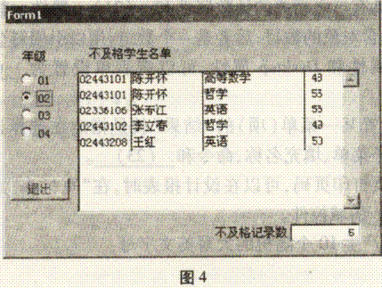 某表單運行時如圖4所示,其功能是查看01~04年級學生需要補考的情況。當用戶利用選項按鈕組(opt1)選擇一個年級時,列表框(listl )中顯示出該年級所有課程不及格的學生的學號、姓名、課程名稱和成績(xh 字段的前兩