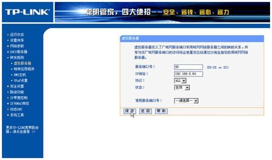 接下來的就是要做端口映射,需要從路由器將錄像機(jī)要用到的80和8000端口映射到192.168.0.64。如果你的錄像機(jī)不是這個IP 就隨之改動好了,具體操作請見下圖; 登錄到路由器的管理界面(默認(rèn)管理的地址為http://192.168.0.1帳號admin 密碼admin ),點擊路由器左邊操作菜單的“轉(zhuǎn)發(fā)規(guī)則”—“虛擬服務(wù)器”。服務(wù)端口號填寫為80 IP 地址就輸入錄像機(jī)的內(nèi)網(wǎng)IP“192.168.0.64”,協(xié)議選擇“ALL”或者“TCP”都可以,然后別忘了保存,那個常用服務(wù)端口只是起到一個幫助提示作用,不用設(shè)置。