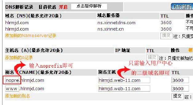 做別名(CNAME )解析到:用戶中心二級(jí)域名如:hlrmjd.web-11.com 如圖:做IP 解析時(shí)需要在主機(jī)(A )記錄來(lái)操作