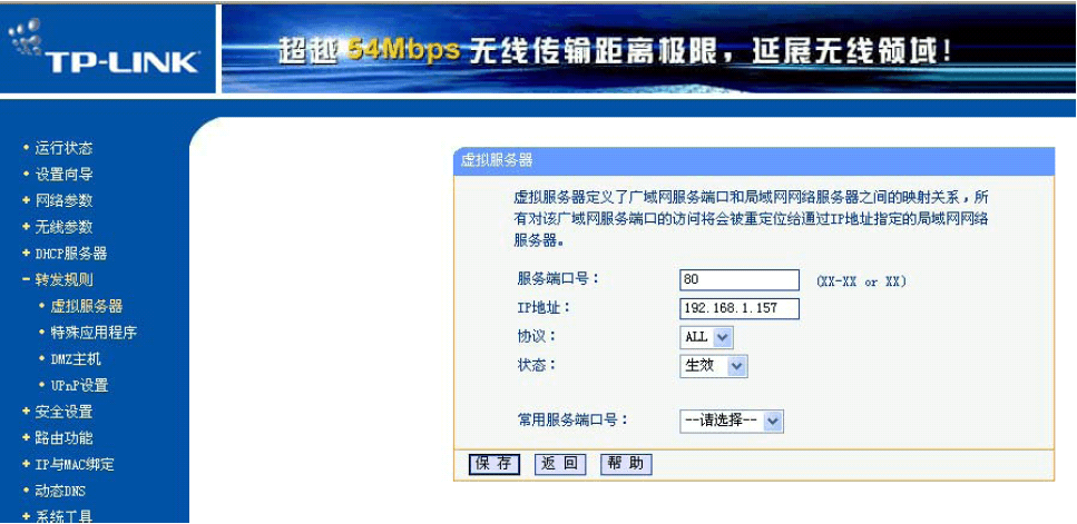 5、在右邊服務(wù)端口號中填“80”,IP 地址中填“192.168.1.157”,協(xié)議選擇“ALL ”,狀態(tài)為“生效”,常用服務(wù)器端口號保持默認(rèn),點擊保存。