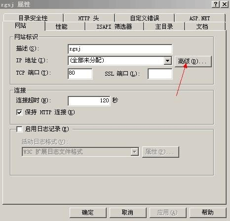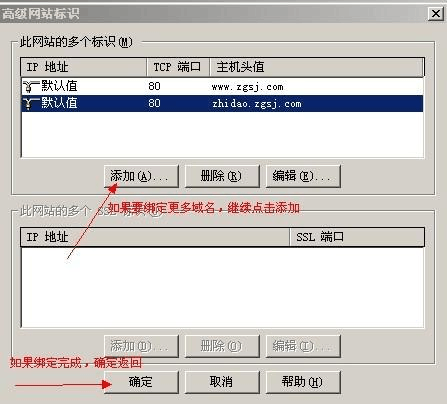 另外有一點值得注意的是zgsj.com 和www.zgsj.com 是兩個不同的主機頭,如果想要能使用zgsj.com 和www.zgsj.com 兩個域名都能訪問你的網(wǎng)站的話,必須把兩個都綁定上去! 填寫好以后確定返回上一界面