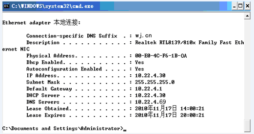 釋放獲得的IP 地址執(zhí)行ipconfig/release命令,重新獲得IP 地址執(zhí)行ipconfig/renew命令,查看是否獲得IP 地址ipconfig/all命令。