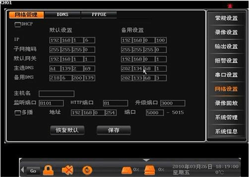 漢邦大部分主機IP 默認為192.168.0.6,由于TP-Link 路由器IP 為192.168.1.1,因此將DVR 主機IP 改為192.168.1.6,網(wǎng)關由默認的192.168.0.1改為路由器地址192.168.1.1,DNS 設為61.139.2.69,端口81和8101