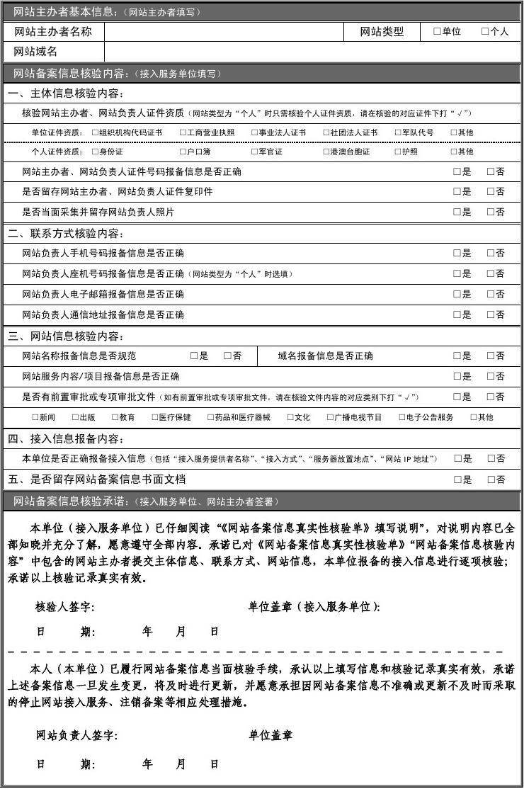 三、接入服務(wù)單位核驗人員需核驗并填寫“網(wǎng)站備案信息核驗內(nèi)容”(在“□”內(nèi)打“√”),簽署“網(wǎng)站備案信息核驗承諾”;網(wǎng)站主辦者填寫“網(wǎng)站主辦者基本信息”,簽署“網(wǎng)站備案信息核驗承諾”。填寫時請使用藍、黑鋼筆或簽字筆。