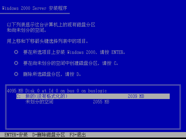 ⑧重啟后,出現(xiàn)為Windows 2000 Server選擇或創(chuàng)建分區(qū)的對話框,按要求完成以后,回車?yán)^續(xù)。