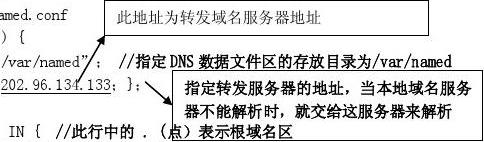 DNS 主配置文件options( directory }; (區(qū)申明)zone “. type hint; //根域名區(qū)申明時(shí),其類型type 必須為hint 緩存域名服務(wù)器 file “named.ca ”;//在根域名區(qū)必須設(shè)定一個(gè)緩存域名服務(wù)器的初始化文件 }; // named.ca