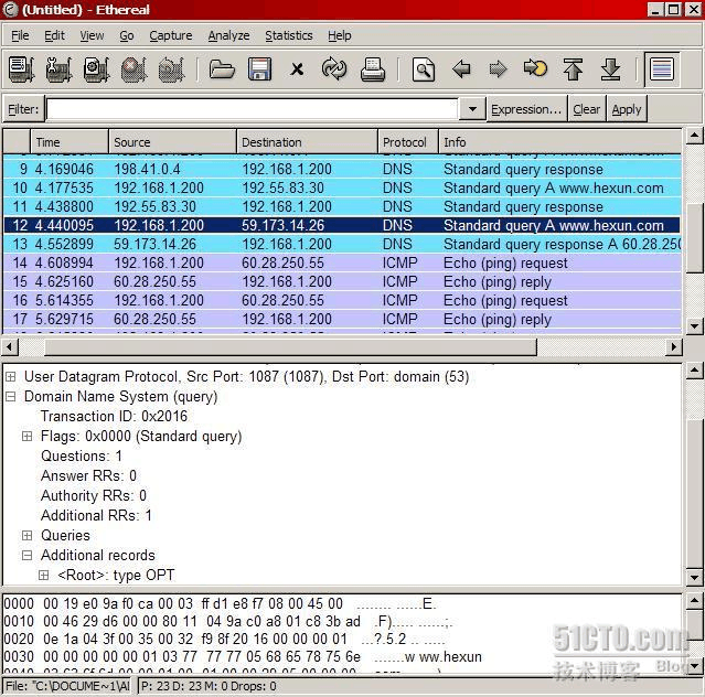 從第12條記錄可以看出,Berlin 這次向59.173.14.26提出了查詢請(qǐng)求,59. 173.14.26就是上圖中提到的負(fù)責(zé)hexun.com 區(qū)域的四個(gè)服務(wù)器之一。這次查詢會(huì)有什么樣的結(jié)果呢?