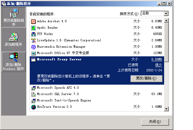 (1)在Windows 2000中打開(kāi)控制面板,雙擊“添加/刪除程序”圖標(biāo),單擊窗口左側(cè)的“添加/刪除Windows 組件”圖標(biāo),如圖1所示。