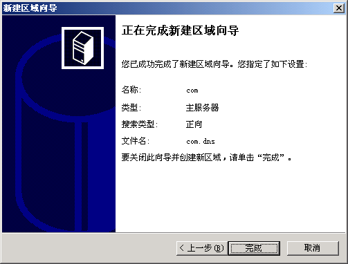 反向搜索區(qū)域用于反向搜索,它將IP 地址解析為域名。Nslookup 之類(lèi)的工具需要反向搜索,此外IIS 中的域名限制也依賴(lài)于反向搜索來(lái)實(shí)現(xiàn)。下面我們以創(chuàng)建正向搜索區(qū)域?yàn)槔?,描述區(qū)域創(chuàng)建的具體步驟:
