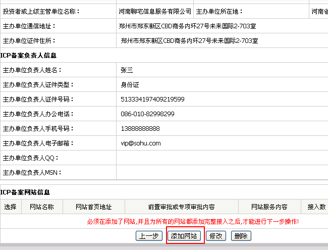 確認(rèn)信息無誤后,點(diǎn)擊完成,此信息必須和河南聯(lián)通ICP 網(wǎng)站備案登記表.doc 信息一致。