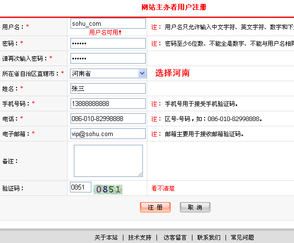 根據(jù)注冊選項(xiàng)進(jìn)行填寫,建議用戶名使用域名下劃線com 之類進(jìn)行注冊,以便記憶,密碼必須是字母和數(shù)字的組合,所在區(qū)域請選擇河南,姓名,手機(jī)號碼,電話,郵箱請?zhí)顚懻鎸?shí)信息。