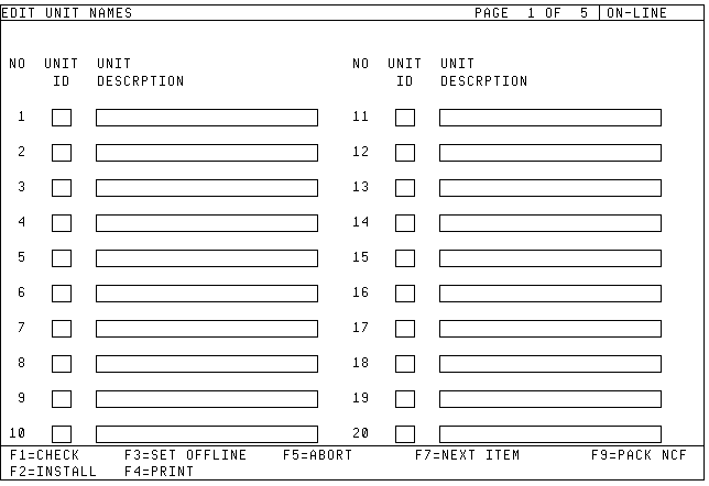 在這一步驟中,首先按組態(tài)格式輸入組態(tài)數(shù)據(jù)。例如:單元名、區(qū)域名等,每組數(shù)據(jù)輸入完畢后按[ENTER]鍵確認。輸入的數(shù)據(jù)全部存入NCF 工作文件NCF.WF 中,該文件暫存輸入的組態(tài)數(shù)據(jù)直到完成一個“安裝”功能?!鞍惭b”功能將此工作文件更名為用戶自己的NCF 。