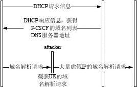 常見的DOS攻擊通常采用IP欺騙等方式向服務(wù)器發(fā)送大量的無用數(shù)據(jù)包。SA建立之后,IMS能夠杜絕IP地址欺騙。但是UE在發(fā)送(11)REGISTER消息之前,沒有對所傳送的消息進(jìn)行任何保護(hù)。所以在注冊流程的第一個往返過程中可能發(fā)生DOS攻擊。因?yàn)?GPP/3GPP2沒有對如何防止DOS對DNS的攻擊作相關(guān)定義,所以可以在P-CSCF發(fā)現(xiàn)流程中對DNS發(fā)起DOS攻擊。設(shè)計(jì)攻擊流程如圖3。