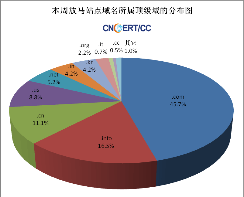 圖為這些放馬站點(diǎn)域名按所屬頂級域的分布情況,排名前三位的是.com (約占45.7)、.info (約占16.5)、.cn (約占11.1