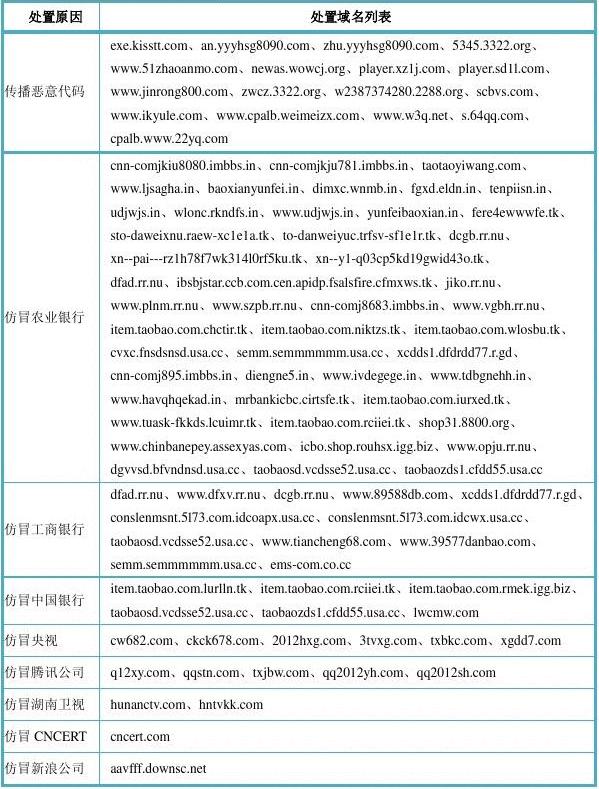 依據(jù)《中國互聯(lián)網(wǎng)域名管理辦法》和《木馬和僵尸網(wǎng)絡(luò)監(jiān)測與處置機(jī)制》等相關(guān)法律法規(guī)的規(guī)定,本周ANV A 在中國電信等基礎(chǔ)電信運(yùn)營企業(yè)以及花生殼、江蘇邦寧、上海有孚、萬網(wǎng)、希網(wǎng)、新網(wǎng)互聯(lián)、新網(wǎng)數(shù)碼等域名注冊服務(wù)機(jī)構(gòu)的配合和支持下,并通過與境外域名注冊商和國際安全組織的協(xié)作機(jī)制,對97個(gè)境內(nèi)外參與傳播網(wǎng)絡(luò)病毒或仿冒網(wǎng)站的惡意域名采取了處置措施。詳細(xì)列表如下所示。