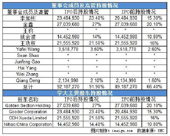 在學大教育董事會成員中,主要持股人包括李如彬、金鑫、姚金波、王功權四人。其中創(chuàng)始人兼董事長李如彬擁有23,484,930普通股,占總股本23.4;創(chuàng)始人兼總裁CEO 金鑫擁有27,039,680普通股,占總股本27;域名投資商,現任58同城網CEO 的姚金波占14.4股份;鼎暉創(chuàng)投創(chuàng)始人王功權占21.50股份。
