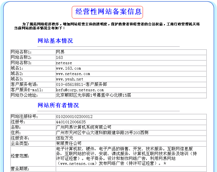舉例:經(jīng)營(yíng)性網(wǎng)站www.163.com 的備案信息。