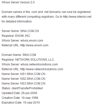 中國(guó)萬維網(wǎng),號(hào)稱是中國(guó)最大的域名和網(wǎng)站托管服務(wù)提供商,不僅提供.cn 的域名注冊(cè)信息,而且還有.com 、.net 等。不過,查詢的結(jié)果是英文的。