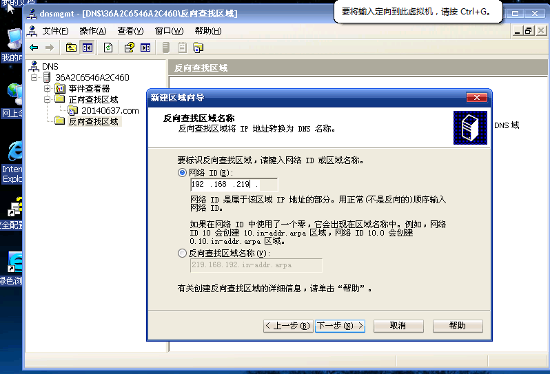 5、右擊“反向查找區(qū)域”|“新建區(qū)域”。選擇“主要區(qū)域”,輸入網(wǎng)絡(luò)ID “192.168.219”,單擊“下一步”,即可完成新建反向查找區(qū)域。