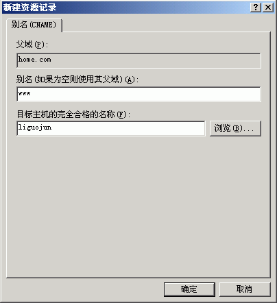 ? 右鍵點(diǎn)擊欲建立別名主機(jī)的DNS 區(qū)域,彈出菜單,點(diǎn)擊“添加別名”選項(xiàng),此時(shí)出現(xiàn)畫面如圖5-7。