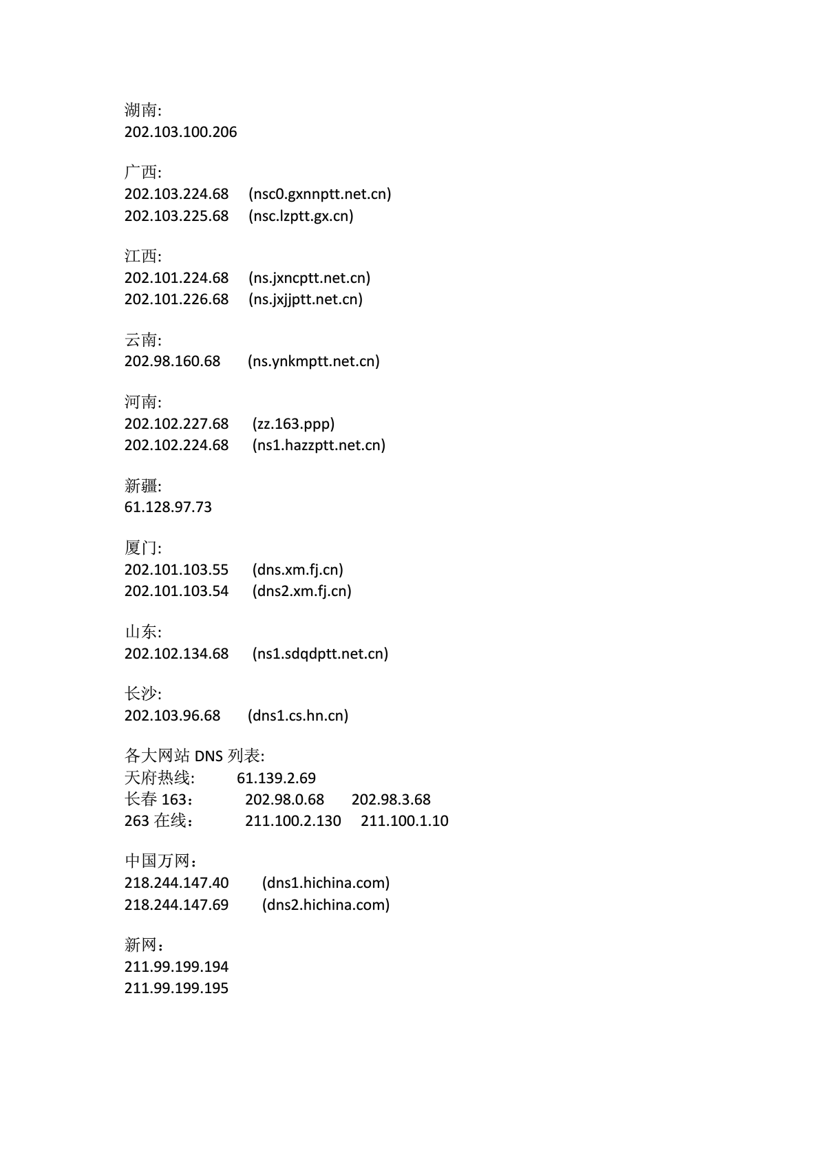 全國各地DNS服務(wù)器IP地址列表