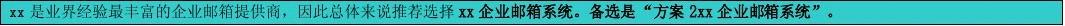 以上三家為國(guó)內(nèi)企業(yè)郵箱領(lǐng)域處于領(lǐng)先地位的郵箱提供商,無(wú)論是硬件、軟件、后續(xù)服務(wù)及未來(lái)發(fā)展等各方面條件都是最優(yōu)越的。建議選擇“方案3:xx 企業(yè)郵箱系統(tǒng)”,購(gòu)買(mǎi)xx 。
