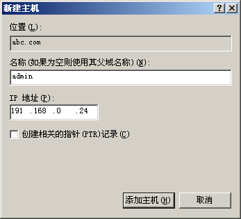 2. 建立域名“admin.abc.com ”, 映射IP 地址“191.168.0.24”的主機記錄。