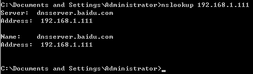 下面輸入命令 nslookup 192.168.1.111 查看能否查看那到 dnsserver.baidu.com 的主機(jī)名: