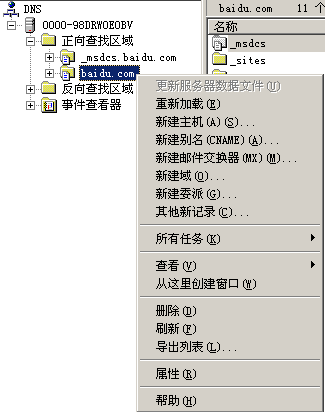 打開 DNS 服務(wù)器:在 DNS 控制臺中:依次打開服務(wù)器和:正向查找區(qū)域:右鍵單擊區(qū)域: