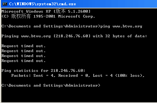 開始→運(yùn)行→輸入cmd 命令,回車,在窗口中輸入:ping www.btvu.org,回車,查詢得到北京電大的IP 地址為:218.246.76.60。