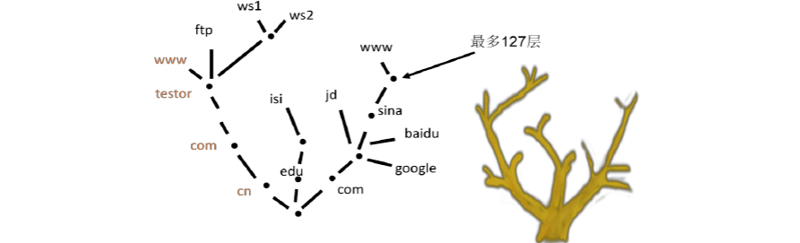 在DNS 體系中,節(jié)點(diǎn)表示域名. 之間的部分,一個節(jié)點(diǎn)標(biāo)識一個域。