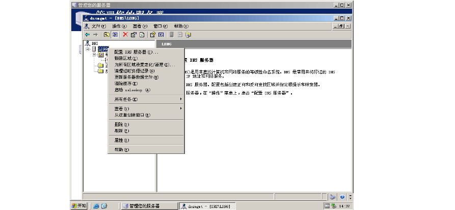 點(diǎn)擊DNS 進(jìn)入管理界面。右擊DNS 服務(wù)器名long 選擇配置DNS 服務(wù)器,如圖2.6~2.14所示。