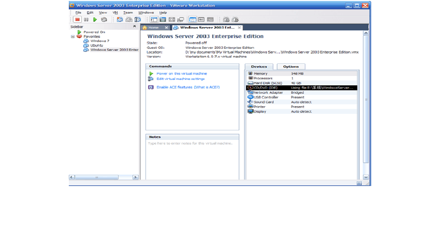 在安裝VMware 成功之后我們下載windows server 2003 enterprise edition 的iso 鏡像文件(文件所在E:系統(tǒng),如圖1.2所示黑色部分)。通過(guò)使用VMware 虛擬機(jī)來(lái)實(shí)現(xiàn)windows server 2003的安裝。點(diǎn)擊New Virtual Machine,安裝步驟對(duì)系統(tǒng)進(jìn)行安裝,安裝之后如圖1.2所示。