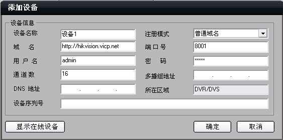 在“域名”處填寫域名 如hikvision.vicp.net. (注:用戶名密碼必須和DVR/DVS匹配)