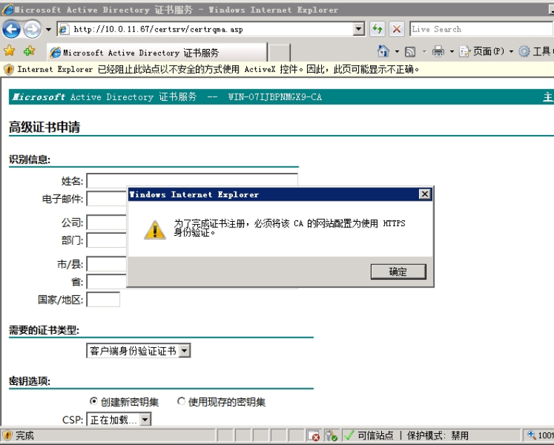 此時會出現(xiàn)證書服務頁面;此網站如果點擊【申請證書】,進入下一界面點擊【高級證書申請】,進入下一界面點擊【創(chuàng)建并向此CA 提交一個申請】,進入下一界面,此時會彈出一個提示窗口:“為了完成證書注冊,必須將該CA 的網站配置為使用HTTPS 身份驗證”;也就是必須將HTTP 網站配置為HTTPS 的網站,才能正常訪問當前網頁及功能;