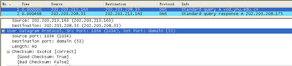 vod.ynu.edu.cn: type A, class IN // 要查詢的域名,類型A,要獲取IP 地址 Name: vod.ynu.edu.cn // 查詢域名為vod.ynu.edu.cn