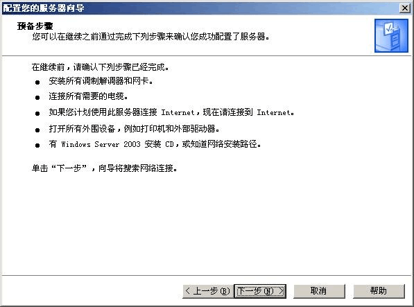 (1)“開始” → “程序” →“管理工具” → “配置您的服務(wù)器向?qū)А?,打開如圖4-1-1所示的對(duì)話框,單擊“下一步”。