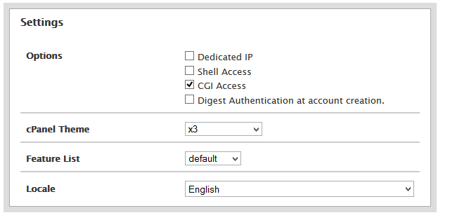 Digest Authentication at account creation:創(chuàng)建賬號時是否進(jìn)行摘要認(rèn)證。 cPanel Theme:cPanel 的主題。