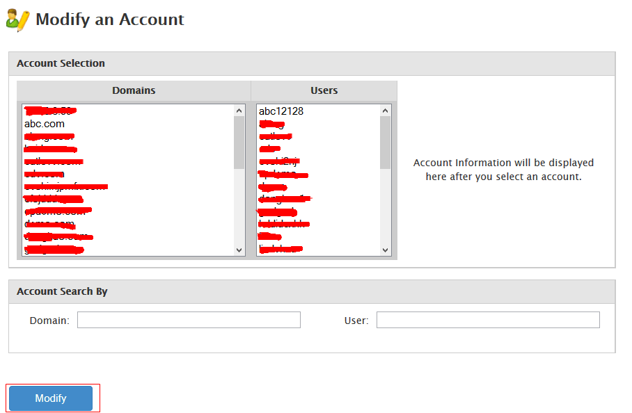 2. 選擇Account Functions 后,再點擊 Modify an Account ,再選中需要修改的域名或者用戶后點擊Modify 。