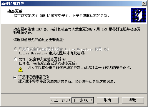 ④ 單擊“下一步”按鈕,彈出“動(dòng)態(tài)更新”對(duì)話框,如圖6. 8所示。選擇“允許非安全和安全動(dòng)態(tài)更新”選項(xiàng)表示任何客戶端接受資源記錄的動(dòng)態(tài)更新,該設(shè)置存在安全隱患。選擇“不允許動(dòng)態(tài)更新”選項(xiàng),表示不接受資源記錄的動(dòng)態(tài)更新,更新記錄必須手動(dòng)。