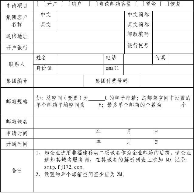 福建移動(dòng)通信有限責(zé)任公司企業(yè)郵箱業(yè)務(wù)申請(qǐng)單受理人: 用戶簽字(單位蓋章):受理日期: 年 月 日