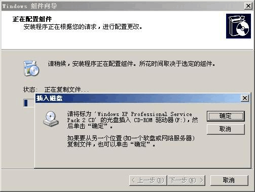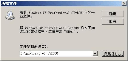 這時(shí)插入Windows XP 的安裝光盤,并在對話框中指定光驅(qū),然后按提示安裝。沒有Windows 安裝盤的同學(xué),可以到本試驗(yàn)作業(yè)上載FTP 上去下載iisxp-v5.1.zip 文件,解壓縮,然后在上述“插入磁盤”對話框中點(diǎn)擊<