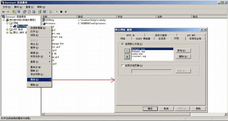 ① 在默認(rèn)網(wǎng)站上右擊,選擇快捷菜單的【屬性】項(xiàng),在【默認(rèn)網(wǎng)站 屬性】對話框中選擇【文檔】選項(xiàng)卡。
