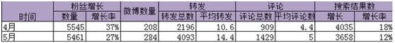 從這個(gè)表中可以看到4、5月的粉絲增量差不多,5月微博信息數(shù)量增加36,轉(zhuǎn)發(fā)總數(shù)也增長(zhǎng)近100倍,評(píng)論增長(zhǎng)了64,搜索結(jié)果數(shù)也是增加了。這些數(shù)據(jù)均直接說明了微博營(yíng)銷效果。